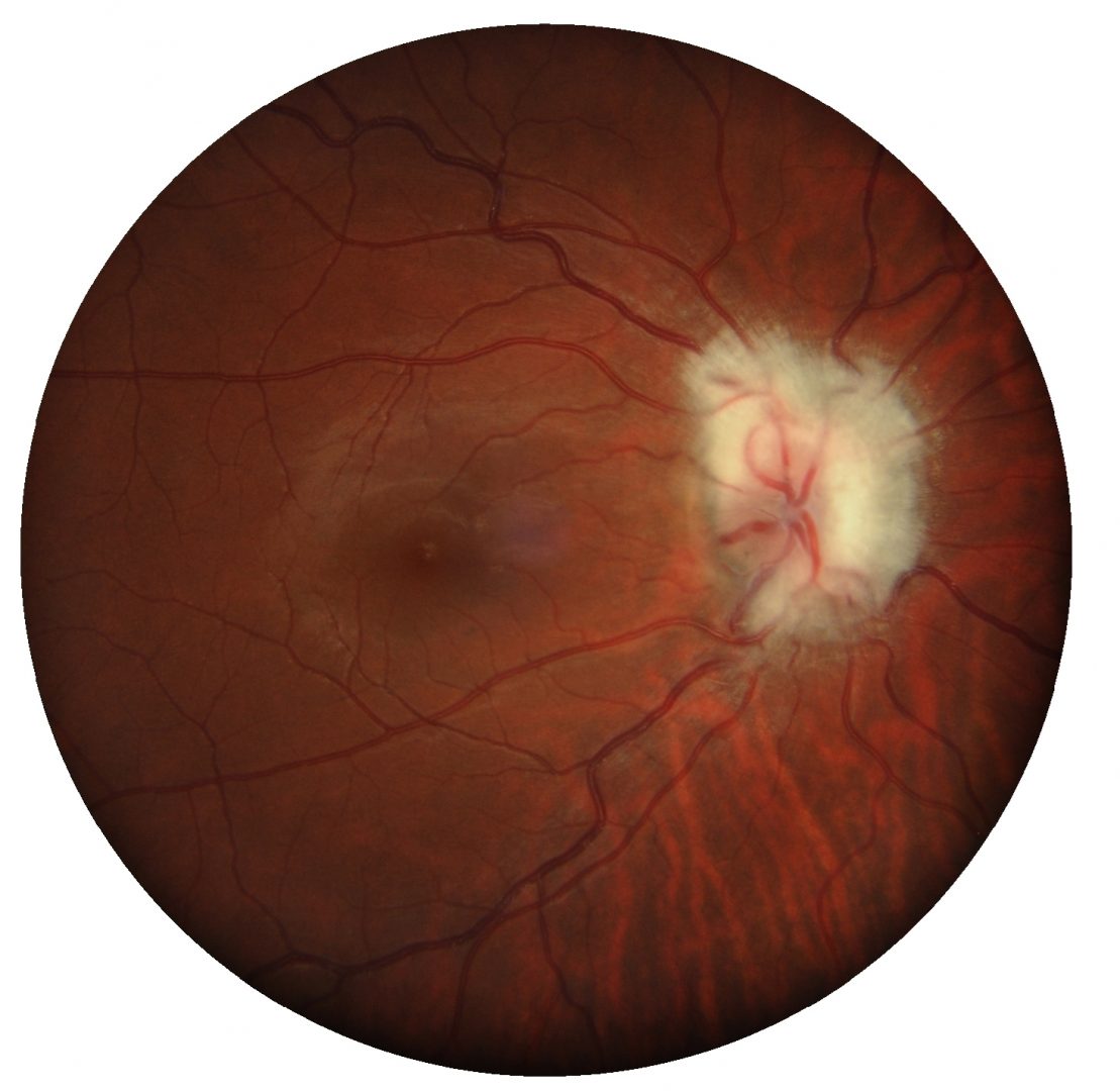 Myelinated nerve fibres appear as a grey-white patches that follow the trajectory of the retinal nerve fibre layer. It exhibits feathery edges and obscures the underlying retinal detail. Myelinated nerve fibres are typically present from birth, usually unilateral and remain stable over time. Rarely, they can develop and/or progress in childhood or adolescence and may even regress in some case reports.