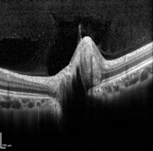 Clinical examination shows a smaller than normal disc with little to no visible cup. Fundus autofluorescence and B-scan ultrasound are unremarkable. OCT imaging shows an apparently elevated optic nerve with no apparent cup and a small Bruch's membrane opening. The retinal architecture adjacent to the optic disc is intact. The nerve may also show a "lumpy bumpy" appearance similar to that created by ONH drusen, however in a crowded disc this is actually due to posterior shadowing caused by the blood vessels trying to enter the small optic foramen. The hypo-reflective areas do not have the hyper-reflective borders seen in disc drusen (further information on disc drusen is available using the tab at the bottom of the page).