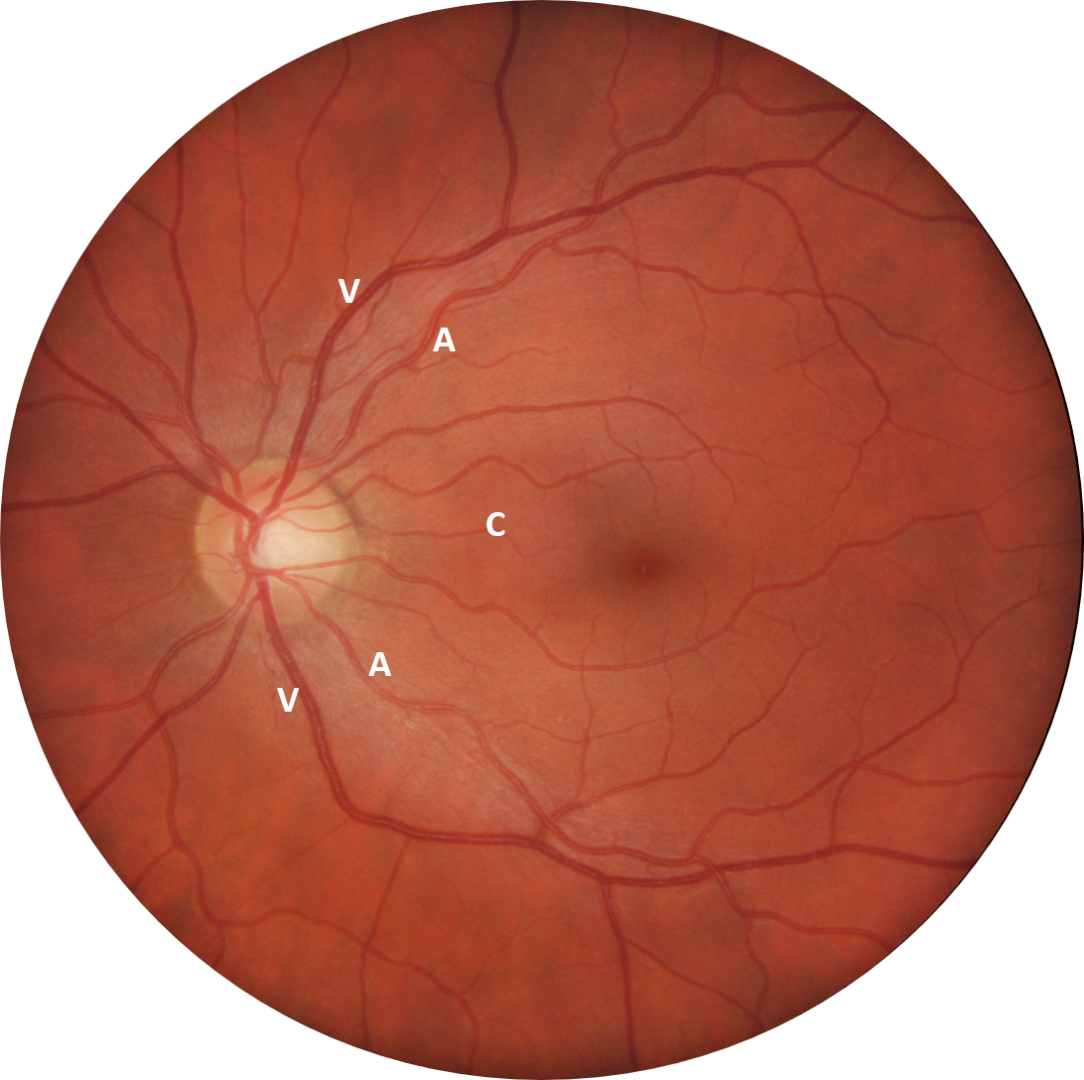 Retinal arteries (marked A in the image) are narrower than retinal veins (marked V), while the veins are darker in colour than the arteries as they are carrying de-oxygenated blood. At the point where the vessels cross the optic disc, an artery is typically 2/3 the width of a vein.