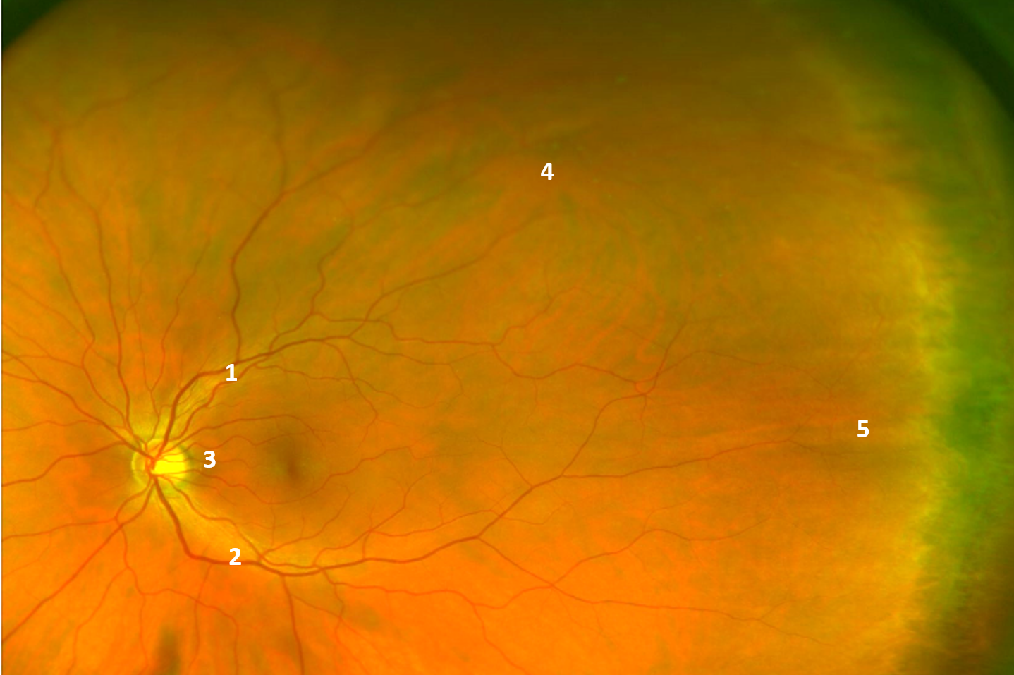 The widefield image shown here illustrates the key vascular features of the retina. The superior vascular arcades (1) and inferior vascular arcades (2) emerge from the optic disc, running temporally in an arcuate shape. These vessels are branches of the central retinal artery which divide further as you move away from the optic nerve.