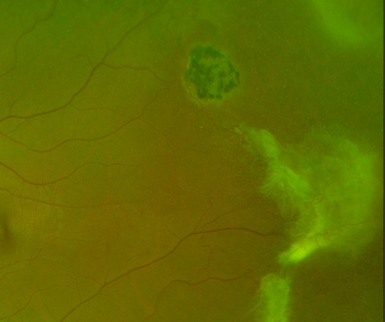 More infoSpectralis OCT line scans (1 - taken through the white lesion in the temporal retina, 2 - taken through the hyper-pigmented supero-temporal lesion)