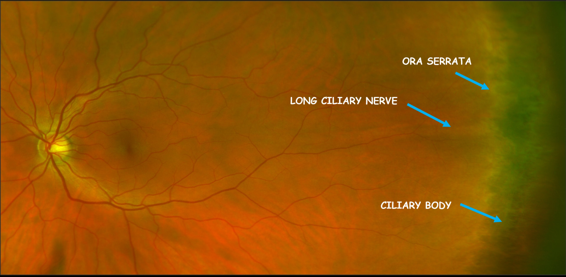 The peripheral retina is defined as the area of retina between the equator and the ora serrata.
