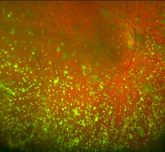 Asteroid hyalosis can usually be seen on slit lamp examination (or with the naked eye). On posterior imaging, dot-like reflective opacities can be seen within the vitreous – appearing as relatively green on Optomap widefield imaging due to their anterior position relative to the retina. The particles are suspended in the vitreous, moving along with the movement of the vitreous body and returning to their previous position after the movement stops.