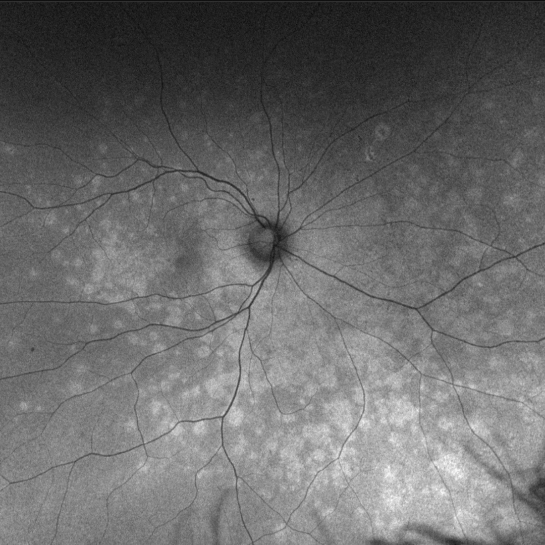 Fundus autofluorescence imaging shows hyper-fluorescence of the white retinal dots and pinpoint hypo-fluorescence in the area of foveal granularity.