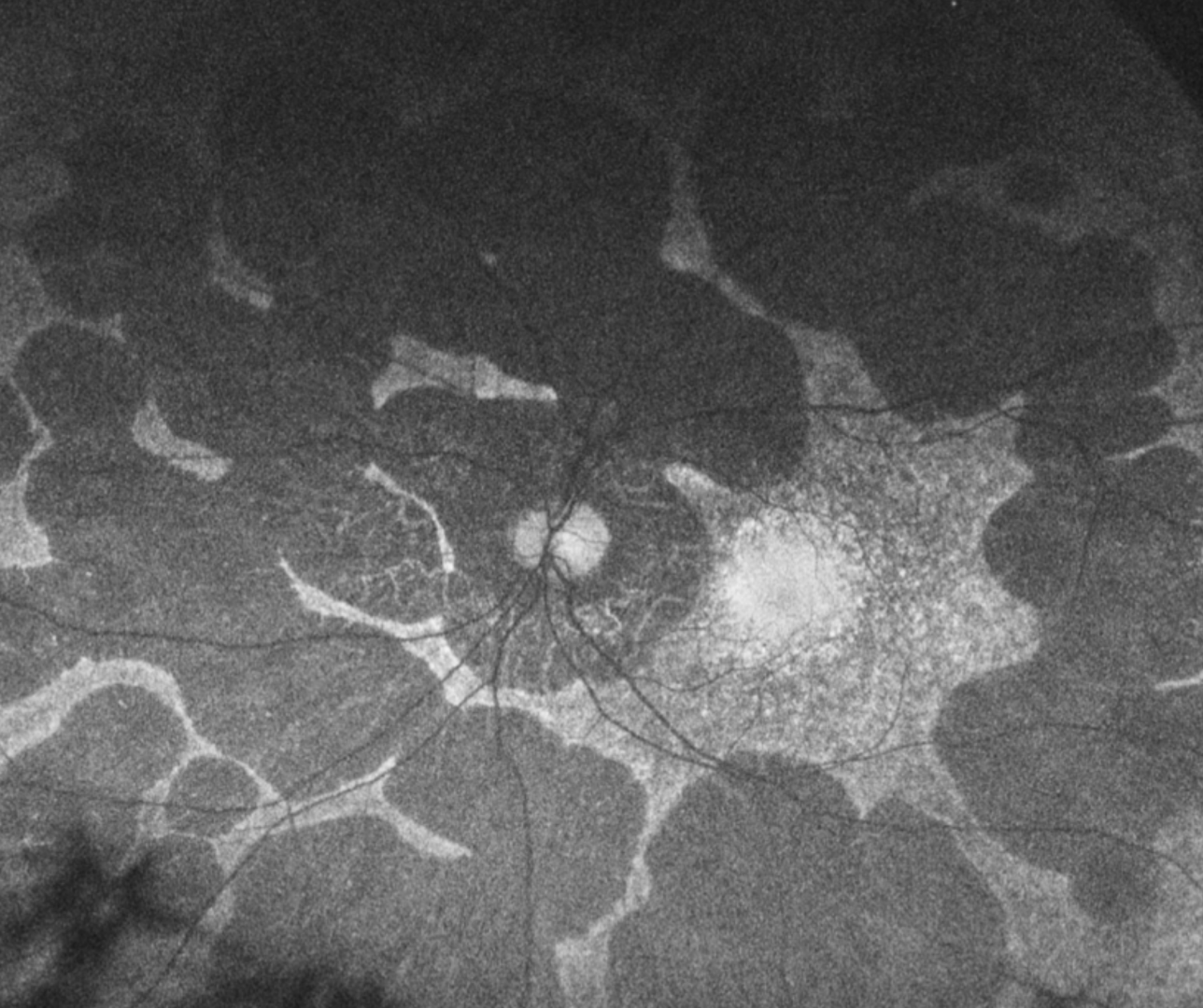 Early in the disease process, patients develop large peripheral areas of chorioretinal atrophy. These areas eventually coalesce forming a scalloped border peripherally, at the junction of the normal and abnormal retina.