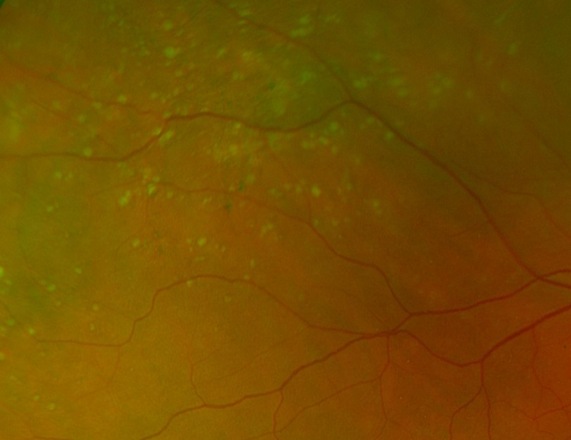 Peripheral drusen present as small, focal, yellow lesions in the retinal periphery, often near the equator. Drusen may have pigmented borders and are often associated with reticular pigmentary degeneration (more information on this condition is available on the link at the bottom of this page).