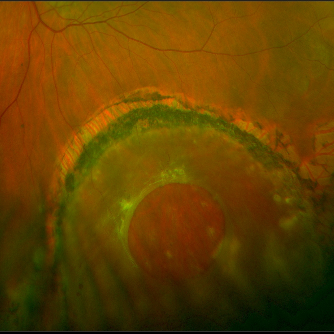 Optomap pseudocolour (top) and green separation (bottom) images - right eye