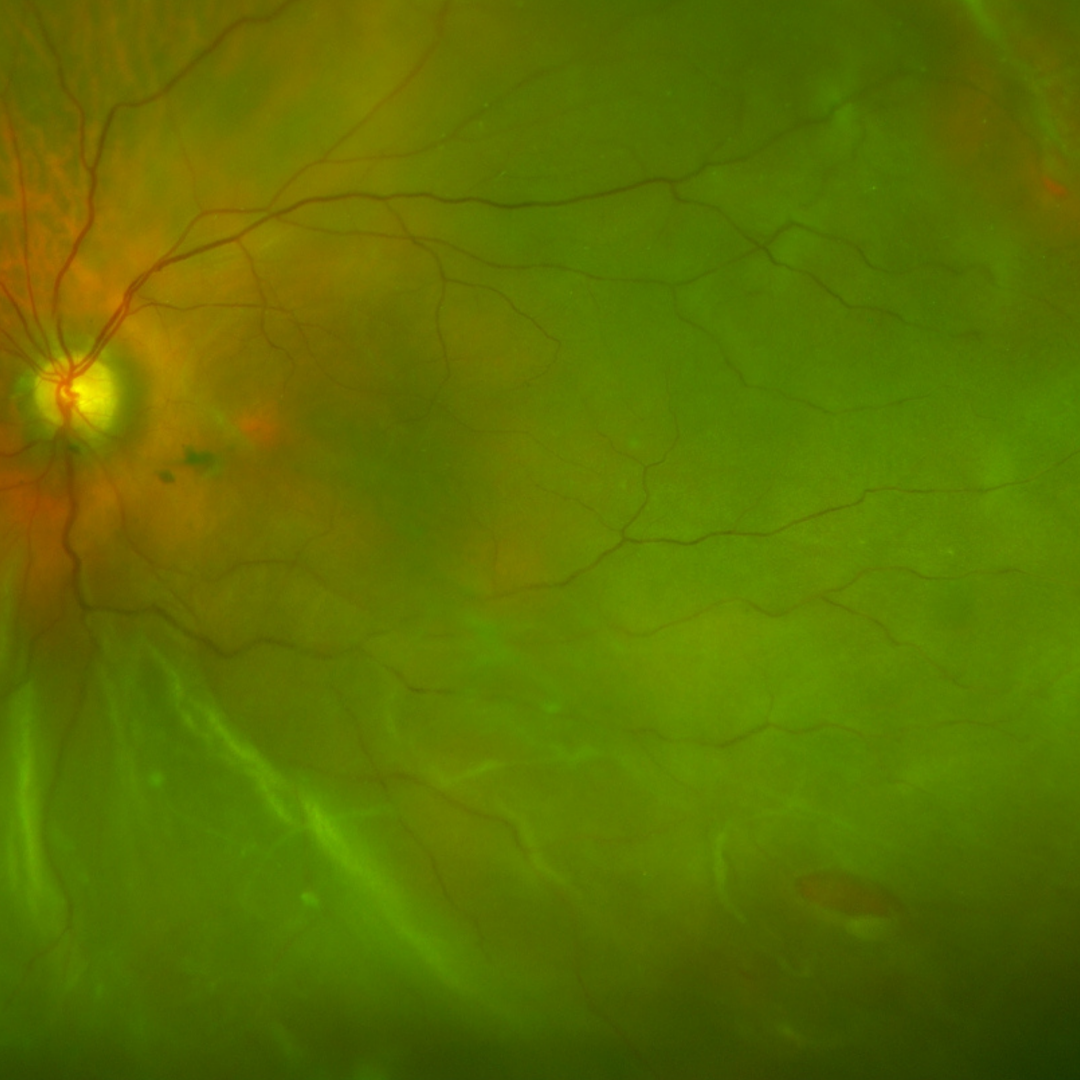 An asymptomatic 53-year-old Caucasian male with a history of blunt trauma to the left eye at 7 years of age. His best corrected visual acuity was 6/7.5 (20/25) in the left eye. There is no history of past laser treatment.