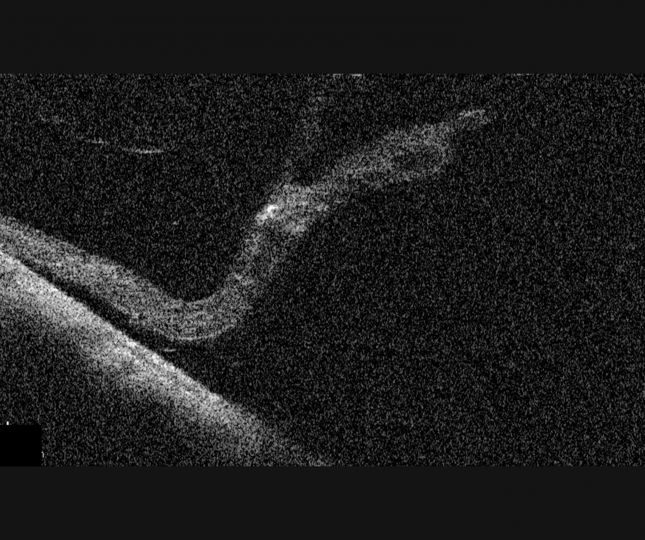 Peripheral OCT imaging can be used to confirm the separation of the photoreceptors from the RPE. The associated retinal break may be seen on OCT as a full thickness break. This initial break allows fluid the opportunity to enter the potential space between the neurosensory retina and the RPE, pushing the two layers apart. Chronic retinal detachments may be associated with retinal cyst formation and RPE hyperplasia.