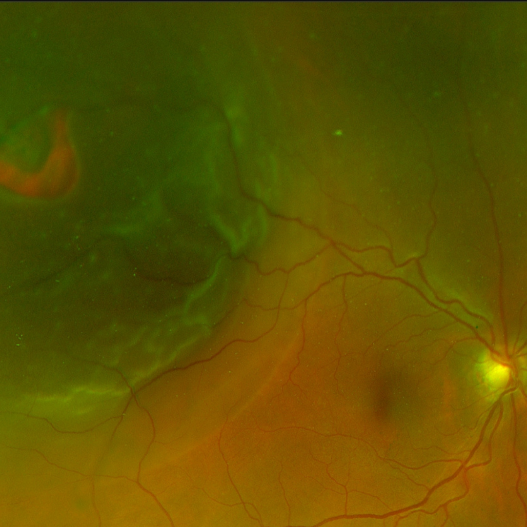 A 48-year-old South American female presented with a 2-month history flashes and floaters with a subsequent black patch in her vision from her left eye. She has a history of amblyopia in that eye but notes that her vision is significantly worse than before.