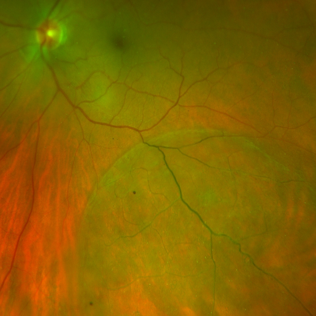 Most cases of retinoschisis are asymptomatic and non-progressive. However, it can progress to a retinal detachment if breaks occur in both the inner and outer “leaf”. In these cases, a break in the inner leaf allows liquified vitreous to enter the retina. A break in the outer leaf then allows this liquified vitreous to enter the subretinal space, causing separation of the RPE and neurosensory retina. In cases of a secondary retinal detachment, the presence of a pigmented demarcation line suggests chronicity.