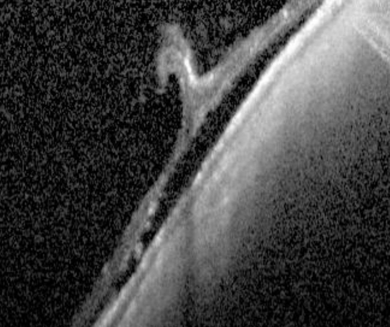 The detached retina in tractional retinal detachments exhibit a concave shape in contrast to the convex shape in rhegmatogenous retinal detachments. In some cases, the tractional forces may cause the retina to tear and in this instance, it is referred to as a tractional-rhegmatogenous retinal detachment (TRRD).