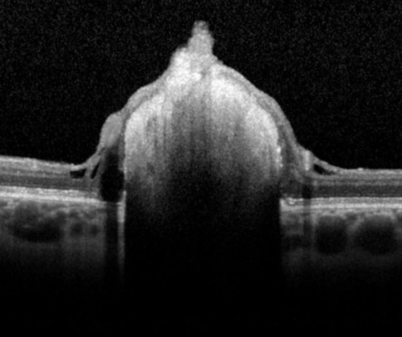 OCT imaging shows an intraretinal hyper-reflective elevation with posterior shadowing. With increasing calcification, moth eaten spaces can be seen internally.
