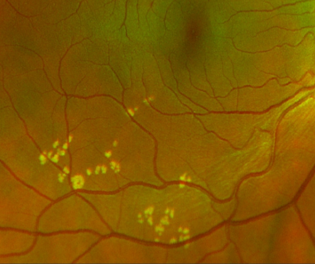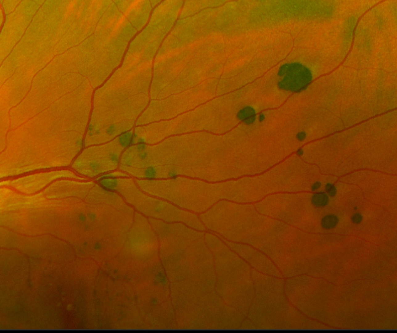 CGP-RPE are characterised by groups of small, well defined pigmented lesions that mimic animal footprints or paws. This condition is also termed as ‘bear tracks’. They can be found in a single sector or quadrant of the fundus and its size typically increases towards the periphery.