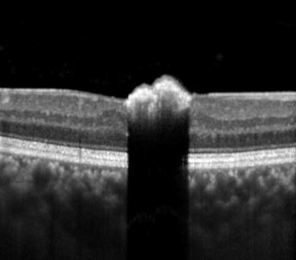 OCT imaging shows an elevated hyper-reflective lesion within the inner retina with deep posterior optical shadowing.