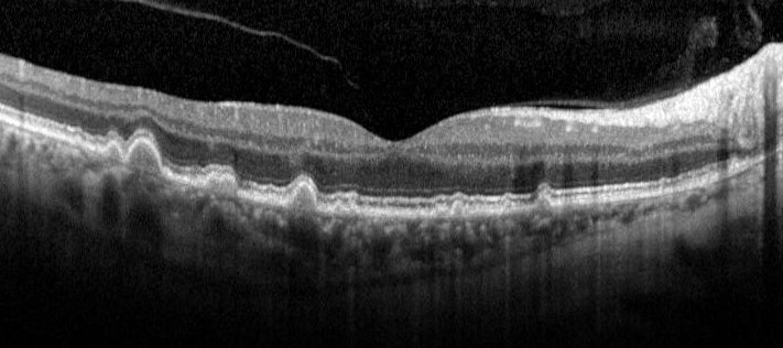 On OCT imaging, drusen appear as dome-shaped elevations of the RPE. Over time, drusen can increase in size and coalesce to become confluent. Pigmentary abnormalities can present as RPE disturbance, thickening or attenuation. In cases of hyper-pigmentary abnormalities, hyper-reflective foci in the outer nuclear layer and posterior shadowing can be found. Conversely, hypo-pigmentary changes may result in an increased transmission of the OCT signal.