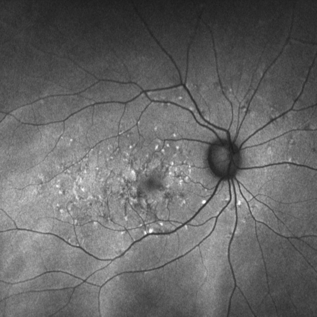 Similar to Stargardt disease, multifocal pattern dystrophy presents with irregular yellow flecks within the posterior pole. These flecks are initially hyper-autofluorescent but can change over time. OCT shows disturbance and abnormalities in the photoreceptor outer segment-RPE level.