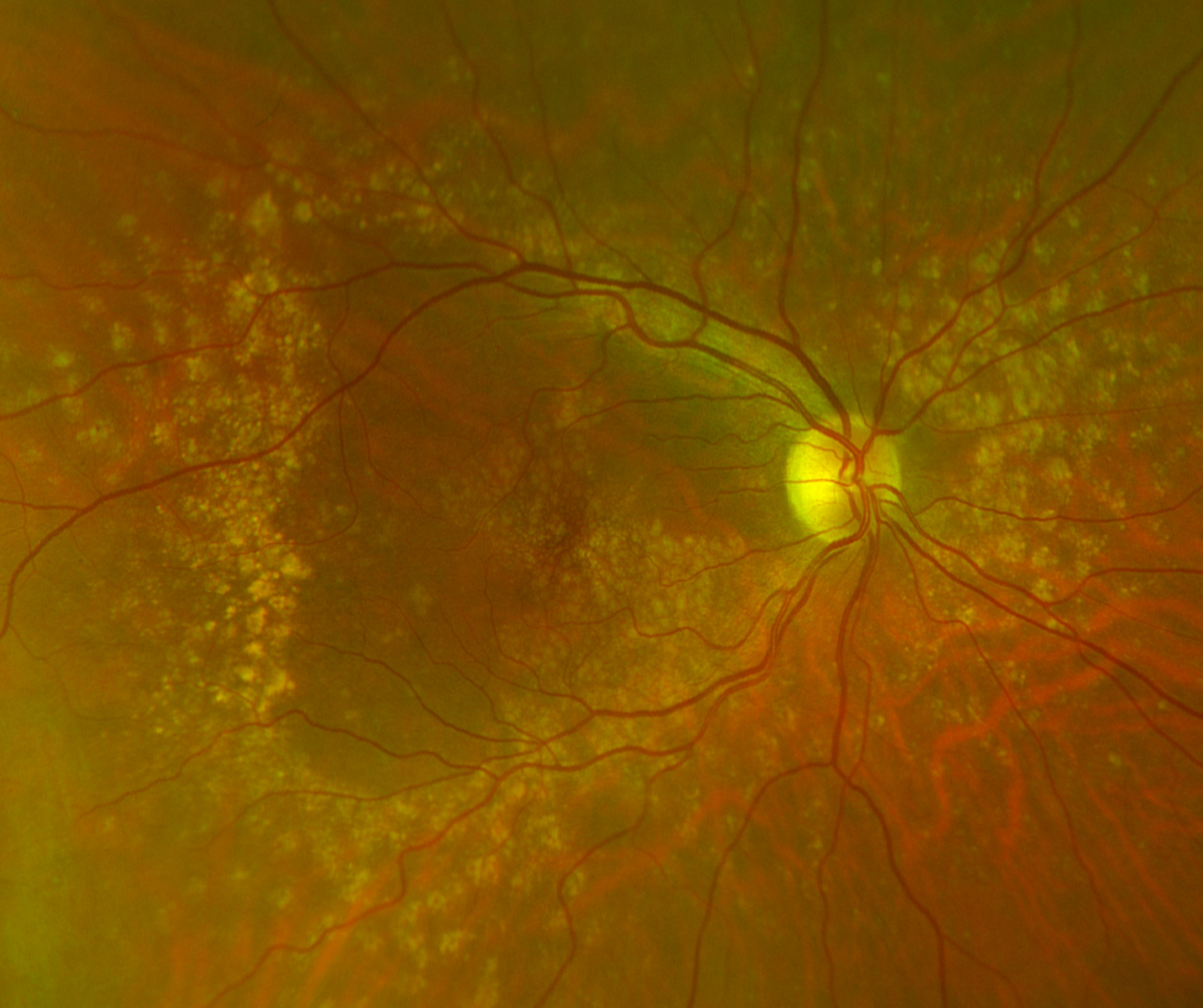 Fundus photography and wide field imaging typically show small drusen in a radial distribution temporal to the macula, large drusen at the posterior pole, and/or drusen nasal to the optic nerve head. Drusen distribution is relatively symmetrical between the eyes.