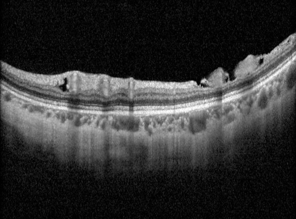 Paravascular cysts appear as small hyporeflective spaces around large retinal vessels. They typically in occur with patients of older age, higher myopia, longer axial lengths and with a posterior staphyloma.