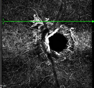 Clinical features include pigmentary changes in the nasal peripapillary area with associated mottled auto-fluorescence. OCT imaging shows dilated "pachy" vessels, the presence of a flat irregular pigment epithelial detachment (FIPED) often with sub or intra-retinal fluid adjacent. OCT angiography shows the choroidal neovascular network in the peripapillary region.