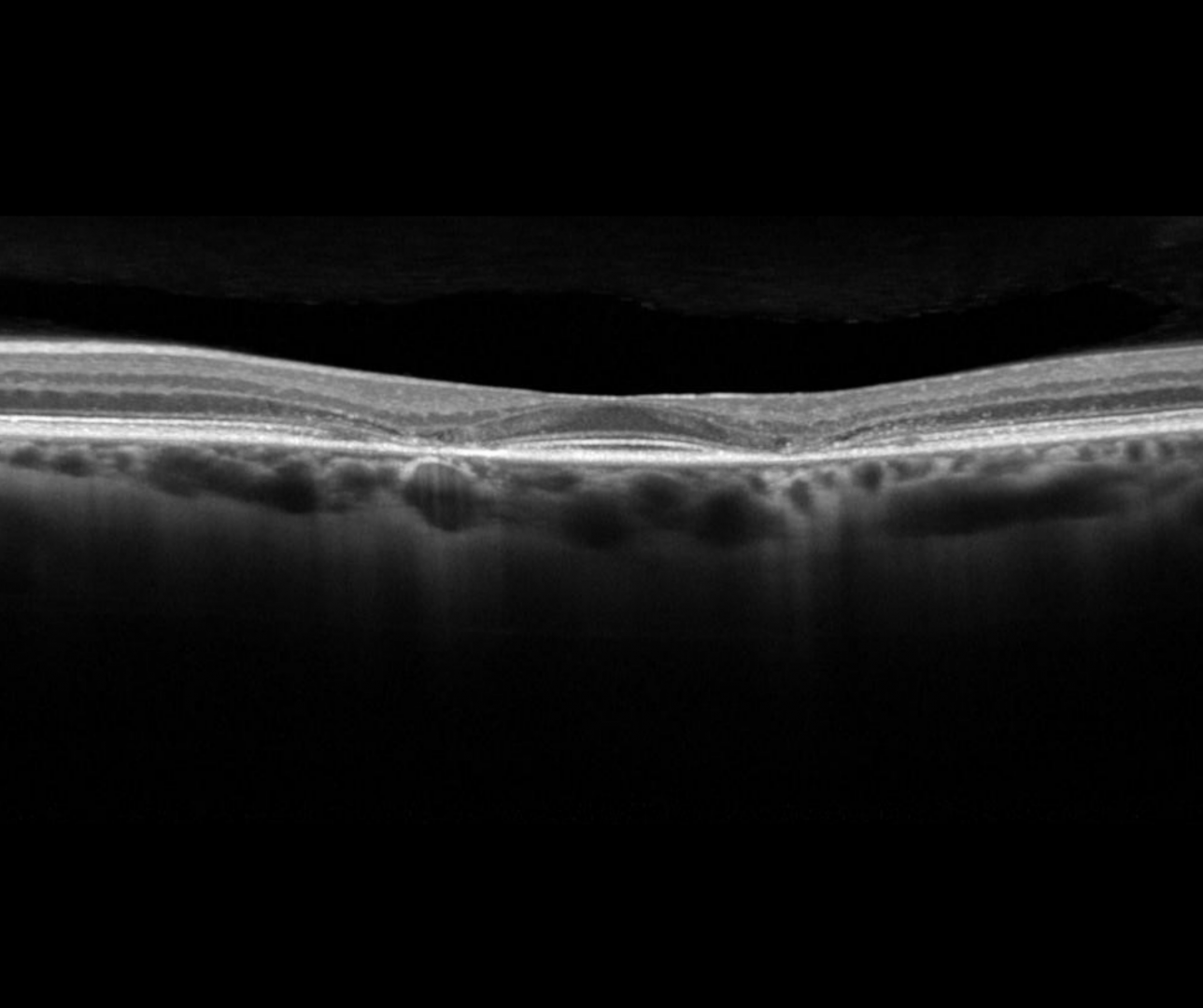 OCT imaging shows disruption of the parafoveal ellipsoid zone in the early stages. In later stages, the outer retinal layers can be involved. A ‘flying saucer’ sign may be seen on an OCT line scan which describes preservation of the subfoveal layers but perifoveal loss of the ellipsoid zone (EZ) on either side.